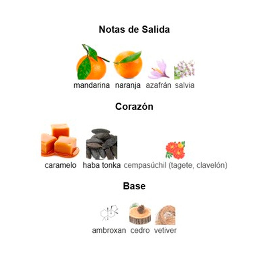 Notas de Salida: Mandarina vibrante, naranja, azafrán y salvia.