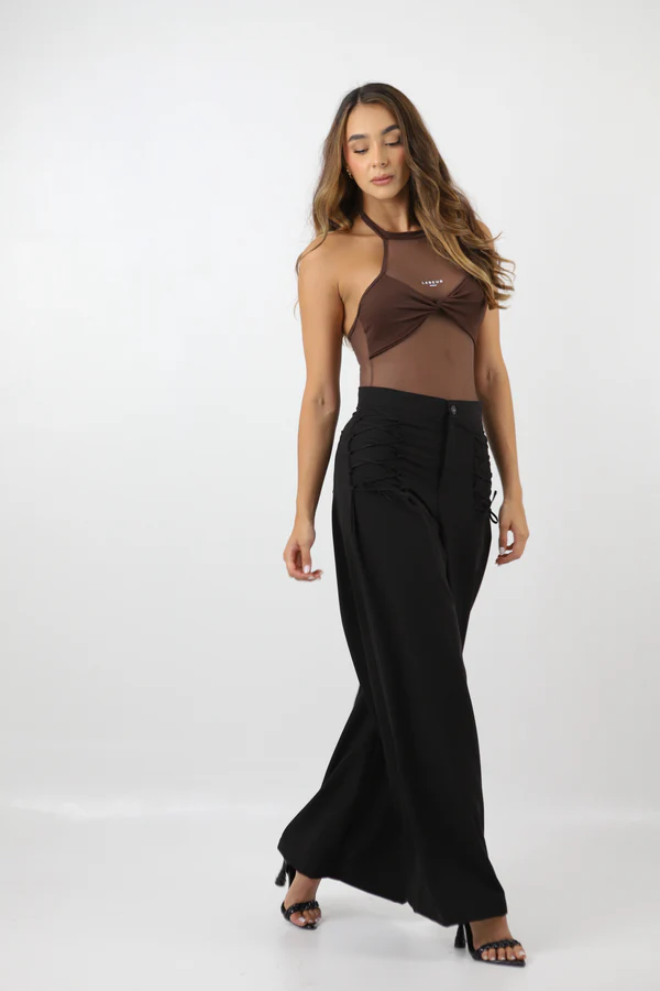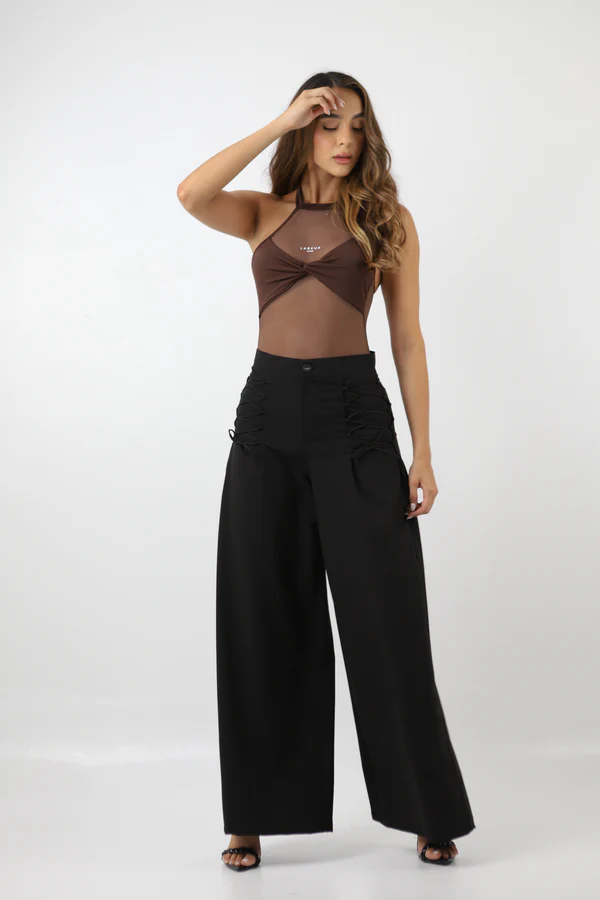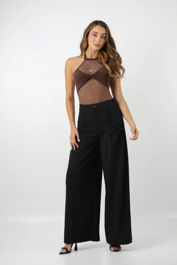 El rasgo distintivo de esta versión son sus cuerdas laterales simétricas, un detalle de diseño de autor que rompe la sobriedad del negro con una textura moderna y vanguardista. Confeccionado en la exclusiva tela Aileen, este pantalón ofrece un tacto sedoso y una resistencia superior al arrugado, permitiendo que la prenda mantenga su estructura impecable desde la mañana hasta la noche. En VENTAS JP, el negro Velin es el básico indispensable para quienes buscan un fit cómodo sin sacrificar el impacto visual.